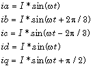 This block converts balanced three-phase quantities into balanced two-phase quadrature quantities. The transformation implements these equations