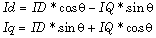 This block converts vectors in an orthogonal rotating reference frame to a two-phase orthogonal stationary reference frame. The transformation implements these equations: