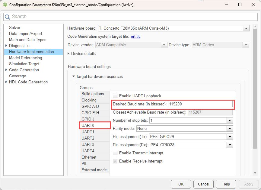 If running External Mode over UART0, ensure that the COM port number entered in the Serial port parameter at Hardware Implementation > Target hardware resources > External mode is correct.