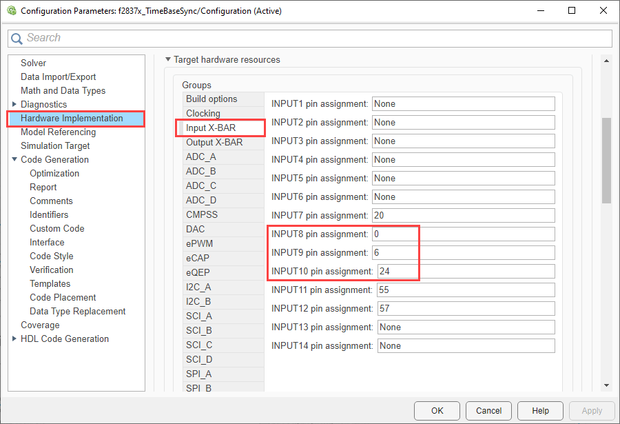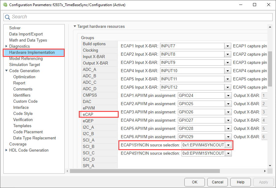 The PWM signals (ePWM1 at GPIO0, ePWM4 at GPIO6 and eCAP1 at GPIO24) are given as input to eCAP through Input X-BAR under Hardware Implementation > Target hardware resources > Input X-BAR.
