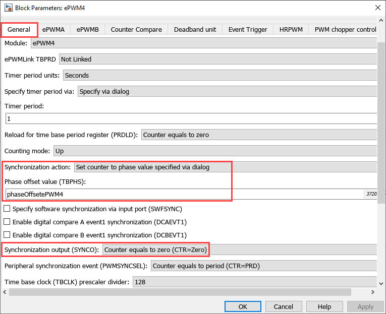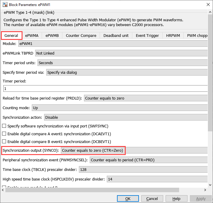 Configure the ePWM1 block to send the signal by setting the Synchronization output (SYNCO) parameter to Counter equals to zero (CRT=Zero)