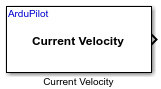 The Current Velocity block outputs the vehicle's current velocity (in m/s) in the NED (North-East-Down) frame, which is a geographic coordinate system used in navigation.