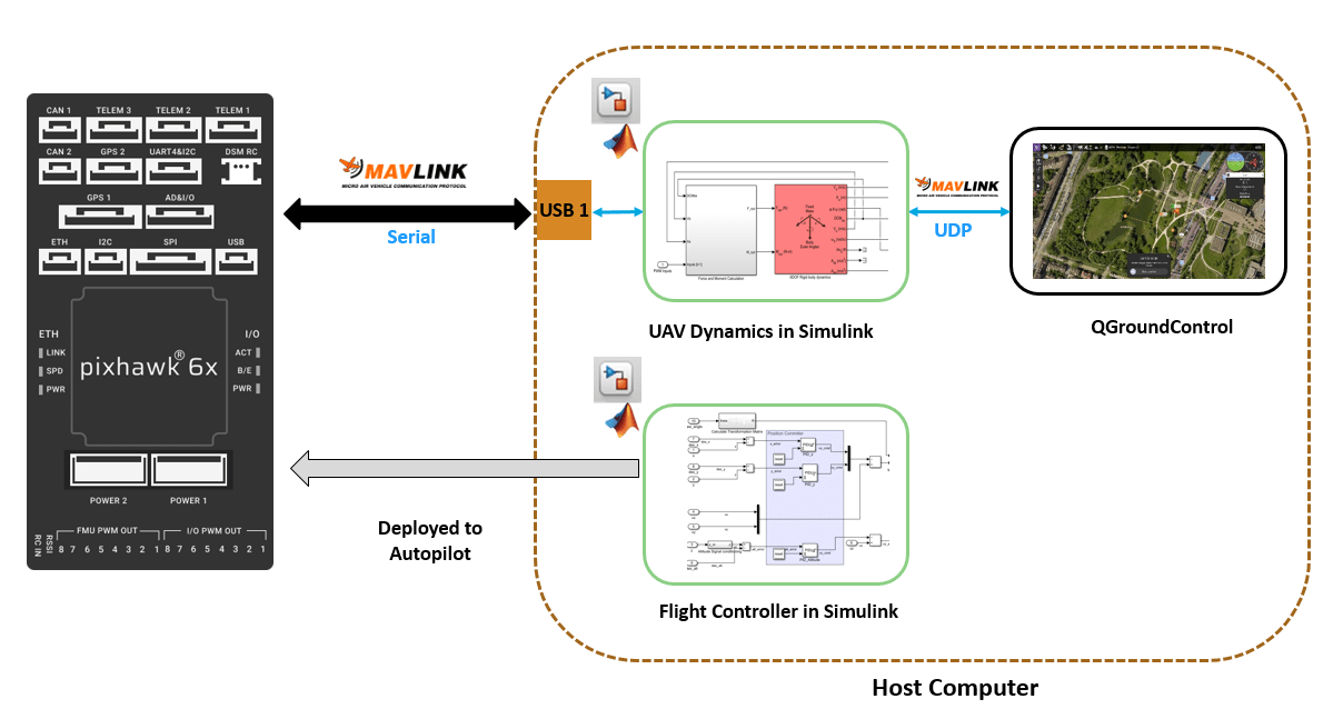 • In the first method, the Controller is deployed on the Autopilot and the UAV Dynamics model will run on MATLAB® on host computer communicating with Autopilot.