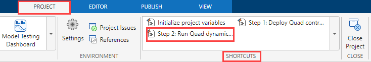 4. Click Step 2: Run Quad dynamics simulation in the Project Shortcuts tab to open the Quad_UAV_dynamics model.