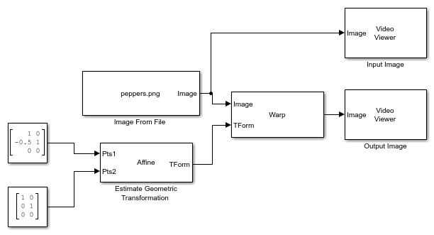 To apply a horizontal shear transformation to the input image, the model uses a Warp block that accepts the input image at the Image input port and the estimated transformation matrix at the TForm input port. The block then horizontally shears the image by using these parameters: