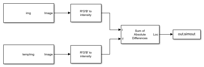 The model reads the images by using the Image From Workspace block. To perform template matching, you must first convert the input color images to intensity images by using the Color Space Conversion block. Then, find the location of the template image in the reference image by using the Template Matching block with these parameter values: