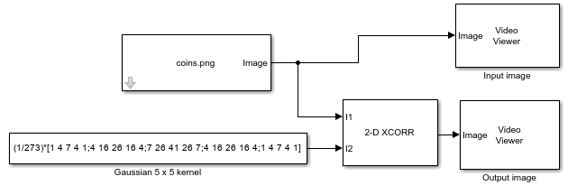 The model then smoothes the image by using a 2-D Correlation block to correlate the input image with a 5-by-5 representation of the Gaussian kernel.