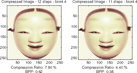 Starting from the eleventh loop, the result can be considered satisfactory. The reached BPP ratio is now about 0.35. It can even be slightly improved by using a more recent method: SPIHT (Set Partitioning In Hierarchical Trees).