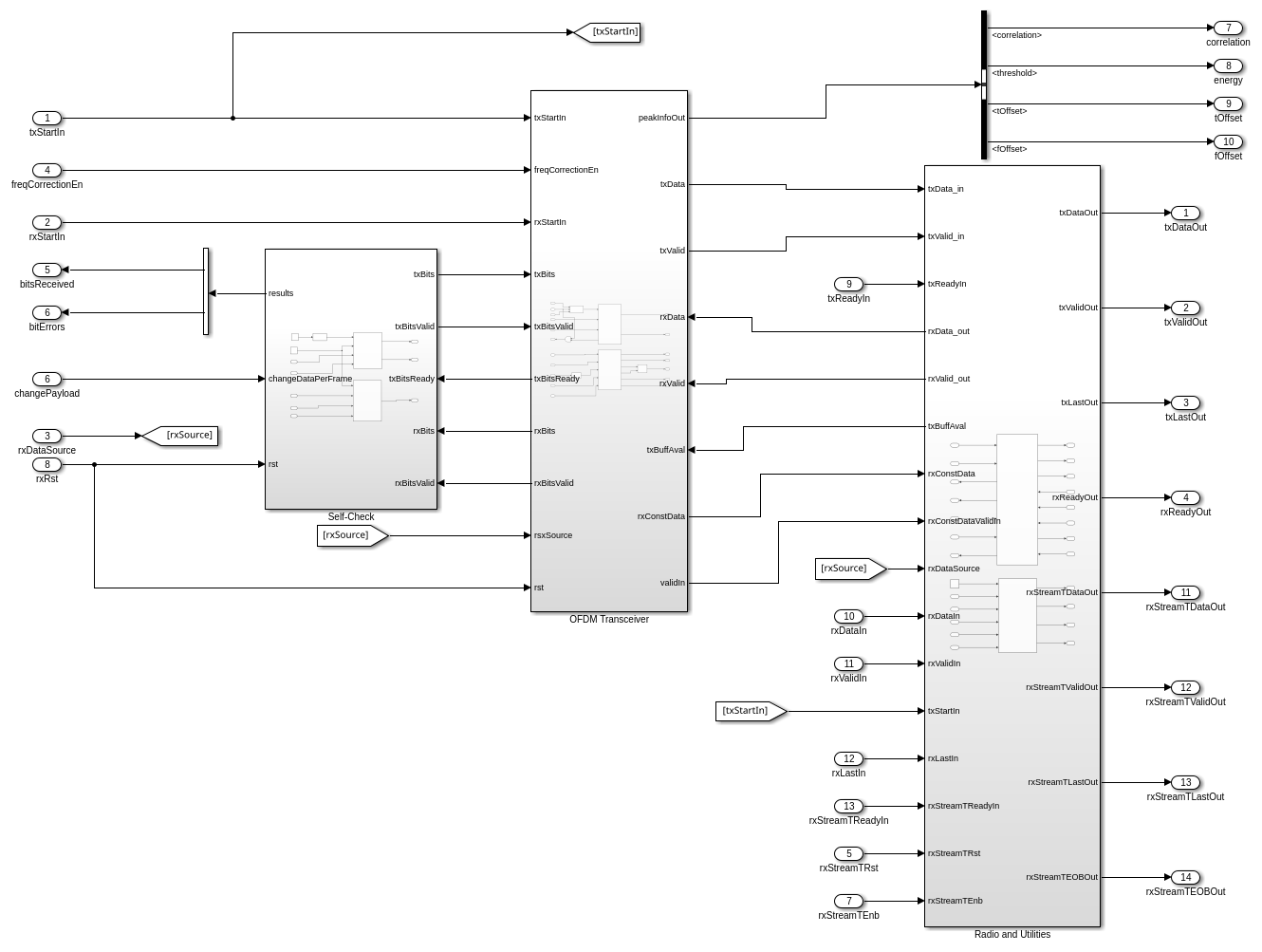 OFDM Transceiversubsystem implements the algorithm from the Introduction to Custom OFDM (Wireless HDL Toolbox) example, which includes an OFDM transmitter and receiver.The