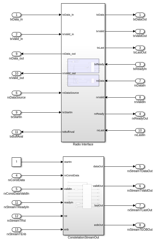 The Radio and Utilities subsystem contains the Radio Interface subsystem and the ConstellationStreamOut block.