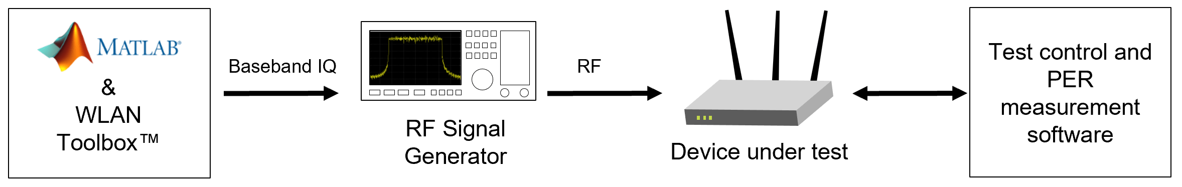 WLAN Toolbox™ can be used to generate standard compliant waveforms for performing receiver tests. A basic WLAN receiver test scenario is shown in the diagram below.