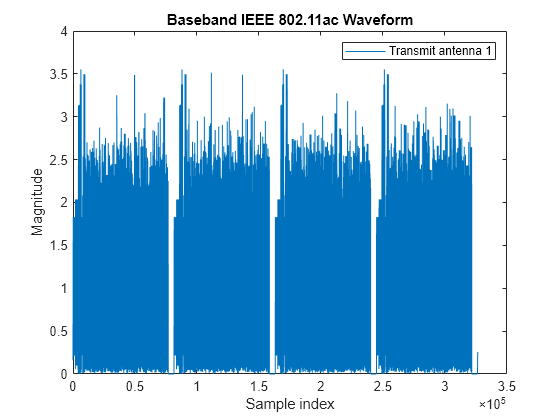 Figure contains an axes object. The axes object with title Baseband IEEE 802.11ac Waveform, xlabel Sample index, ylabel Magnitude contains an object of type line. This object represents Transmit antenna 1.