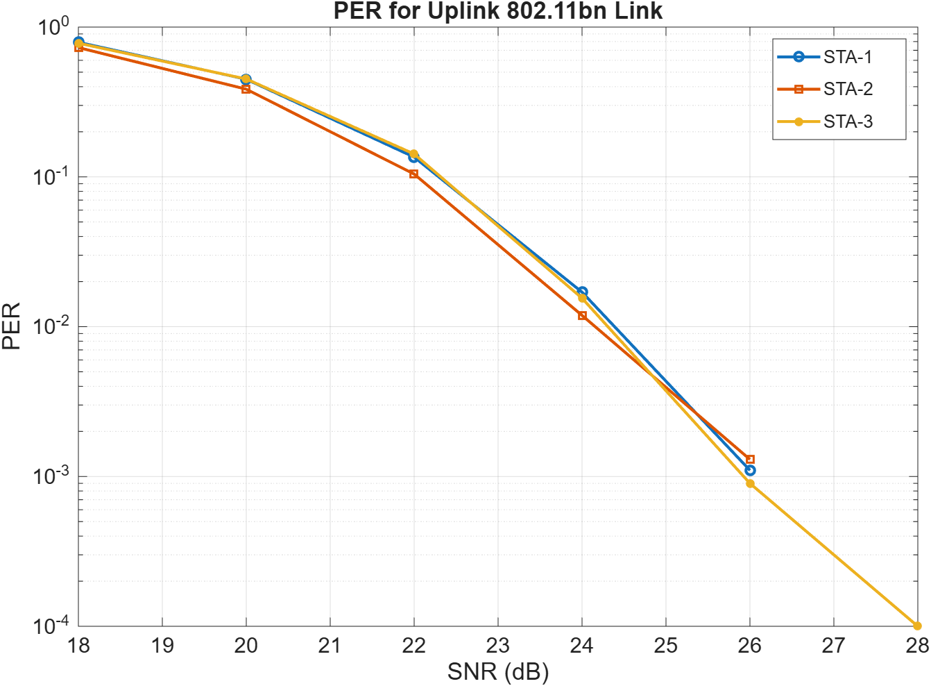Figure contains an axes object. The axes object with title PER for Uplink 802.11bn Link, xlabel SNR (dB), ylabel PER contains 3 objects of type line. These objects represent STA-1, STA-2, STA-3.